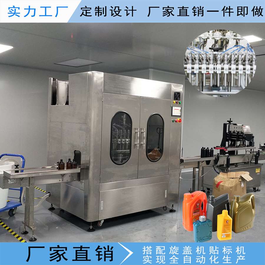 此生產(chǎn)線主要應(yīng)用于日化廠,化工廠,汽車用品等行業(yè)。例如:洗衣液,洗潔精,洗發(fā)水,沐浴露,潤滑油,剎車油,汽油添加劑等,設(shè)備采用先進(jìn)的光、電、氣一體化自動控制系統(tǒng),實(shí)現(xiàn)進(jìn)瓶,定位,灌裝,出瓶自動化生產(chǎn)。