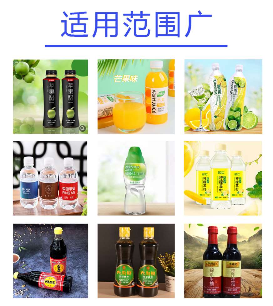 此生產(chǎn)線主要應(yīng)用于食品廠,酒廠,日化廠,化工廠,汽車用品等行業(yè)。例如:各種酒類,醋,醬油,飲料,水,剎車油,汽油添加劑等,設(shè)備采用先進(jìn)的光、電、氣一體化自動控制系統(tǒng),實現(xiàn)進(jìn)瓶,定位,灌裝,出瓶自動化生產(chǎn)。